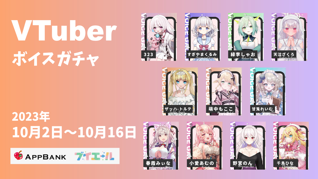 2023年10月2日(月)から 10月16日(月)までの期間限定で、「ザッハ・トルテ、甘兎れいむ、千鳥ひな、天泣ざくろ、すぎやまくるみ、野宮のん、萌中もここ、緑李しゃお、春霞みぃな、小愛あむの、323(みすみ)」11名のVTuberによる『VTuberボイスガチャ』の販売が決定いたしました!
